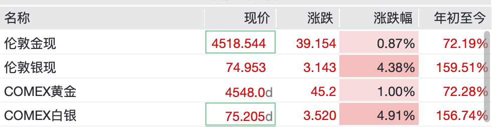黄金、白银、钯等贵金属亦加速上行,纷纷创下新高,其中现货黄金在4520美元/盎司附近震荡,现货白银日内涨超4%,逼近75美元/盎司。